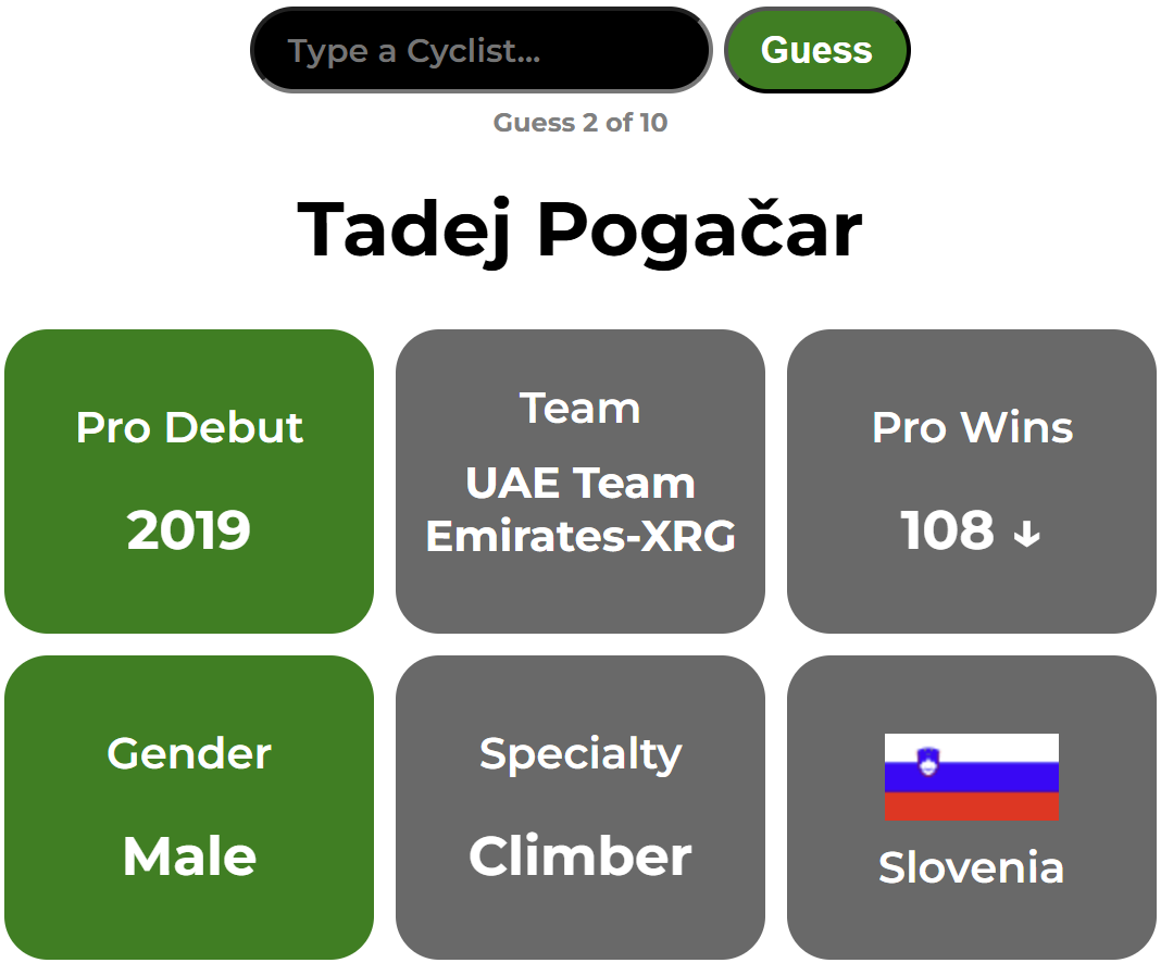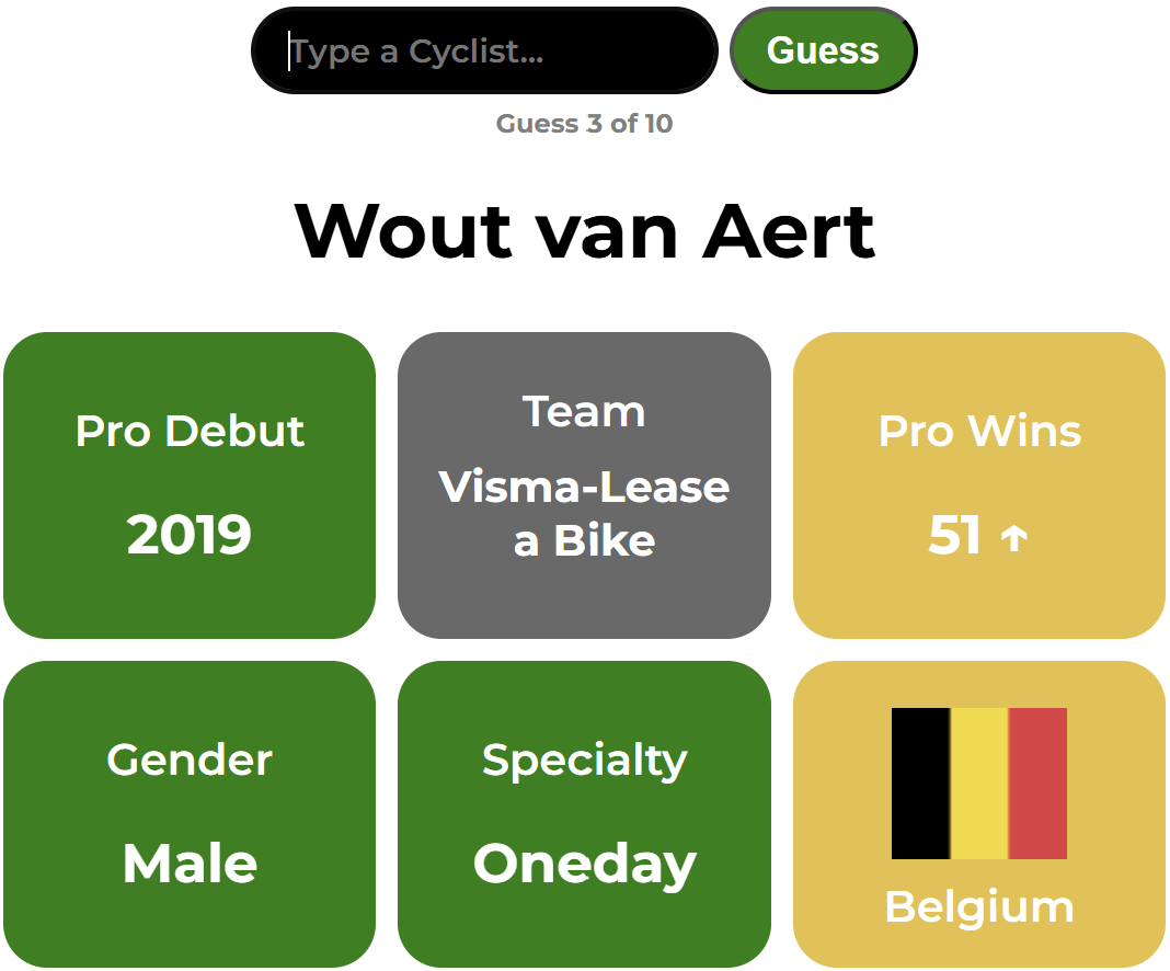 Each guess reveals that cyclist's attributes and compares them to the attributes of the unkown cyclist.